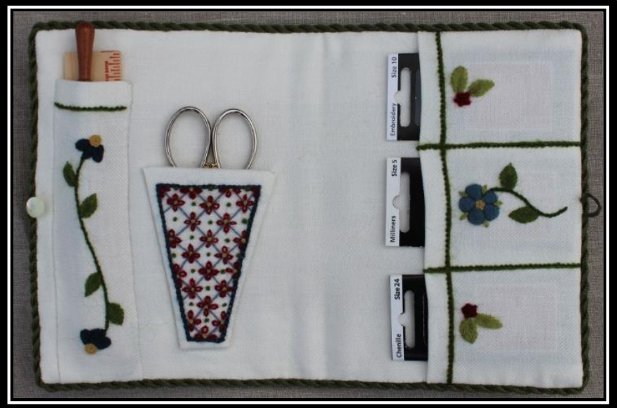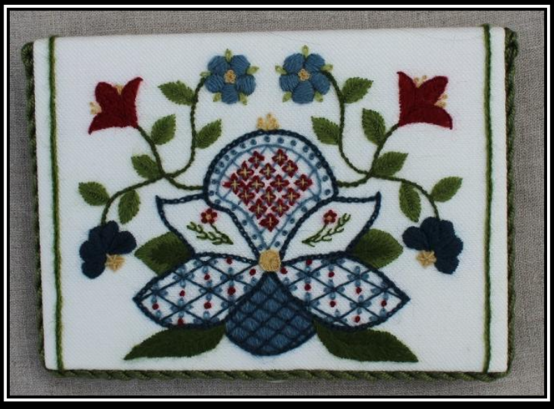 Organize your favorite tools in a beautifully embroidered huswife. Crewel Necessities uses a wide variety of stitches to make the stitching fun. Tips on handling crewel wool, making plump, smooth satin stitch, creating sharp corners with chain stitch and invisibly joining a new thread for line stitches ensure success. Students may embroider the huswife as shown or add their own variations embellishing the diagonal trellis. The back of the class sample is blank. Students may choose to personalize their huswife with initials and/or a date.
