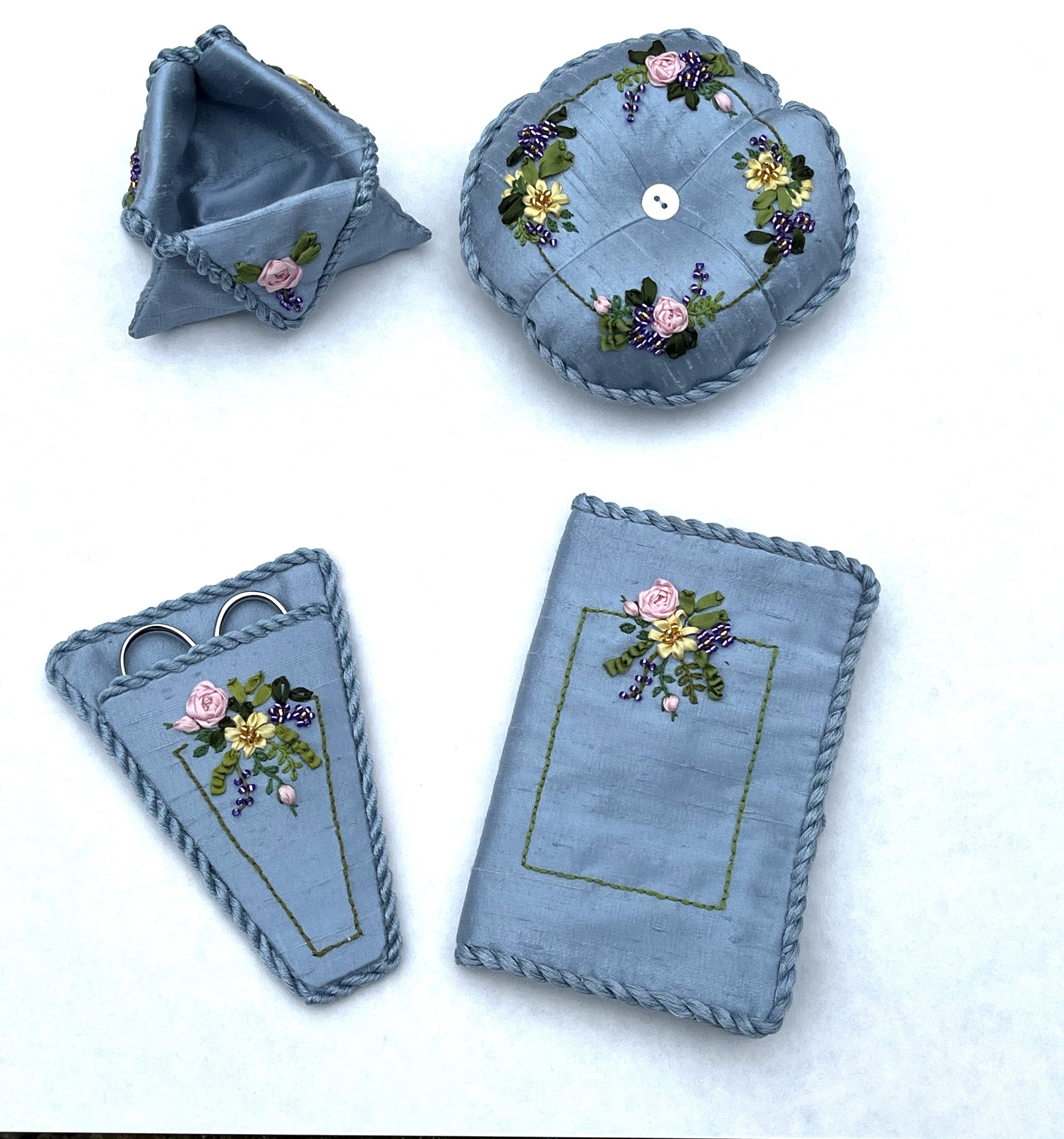 Silk Ribbon Smalls is a suite of four accessories for the embroiderer, a pincushion, scissors keep, ort container and needle book. All materials required to finish the pieces are included in the kit.